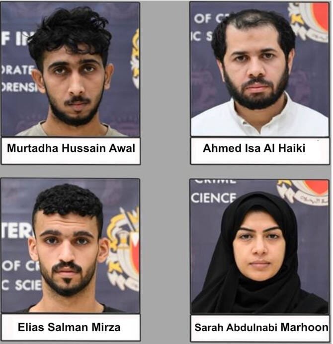 Bahrain’s General Directorate of Criminal Investigation named the detained suspects as Murtadha Hussain Awal (25), Ahmed Isa Al Haiki (34), Sarah Abdulnabi Marhoon (36), and Elias Salman Mirza (22). A fifth suspect, Ali Mohammed Hassan Al Shaikh (25), remains at large and is believed to be residing abroad.
