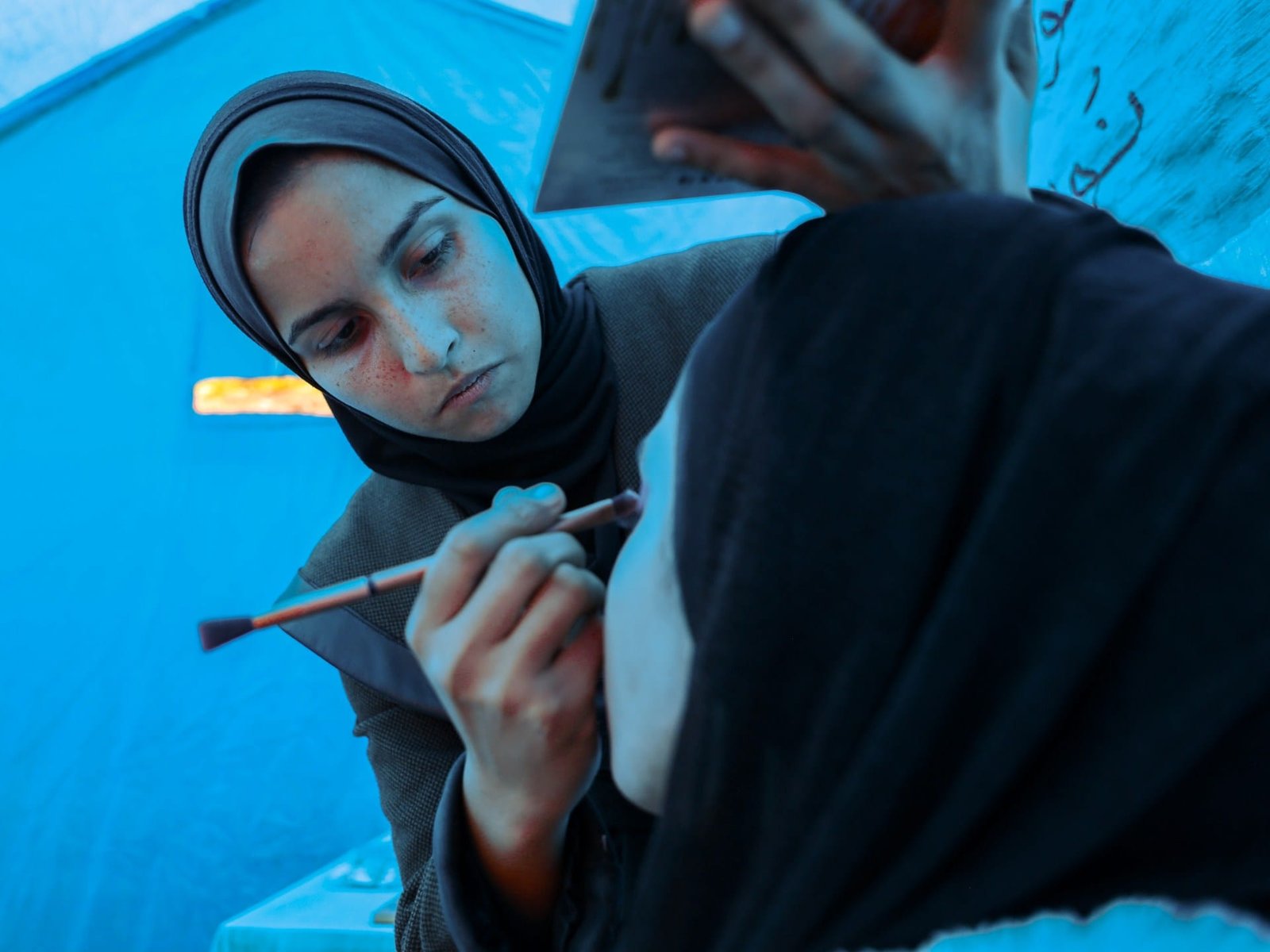 Outside the tent in al-Shujaeya east of Gaza City, a white handwritten sign reading: “Noor’s Salon” hangs near the curtained entrance.