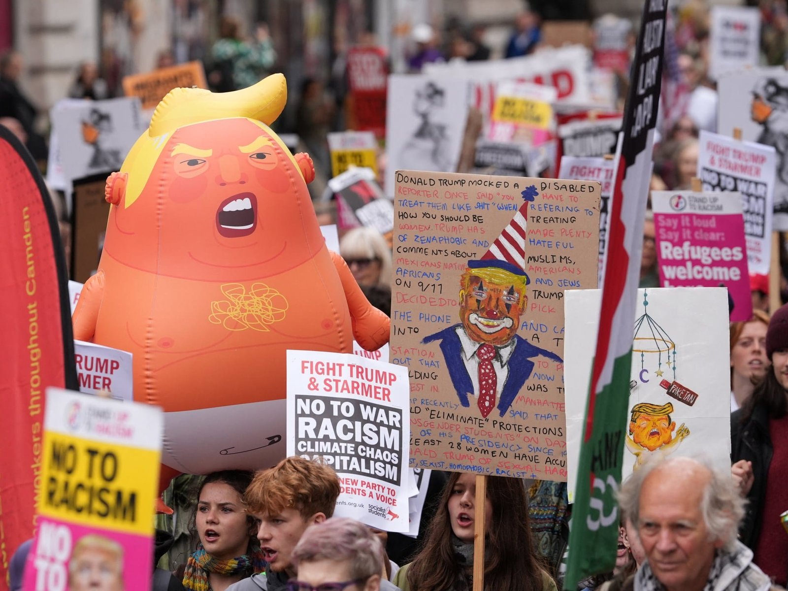 Hundreds of protesters gathered at Portland Place in central London, near the BBC’s Broadcasting House, carrying banners reading “No to racism, no to Trump,” alongside smaller versions of the “Trump baby blimp” that became an icon of mass demonstrations against his first state visit in 2019. The protesters were also marching towards Whitehall and Parliament Square.
