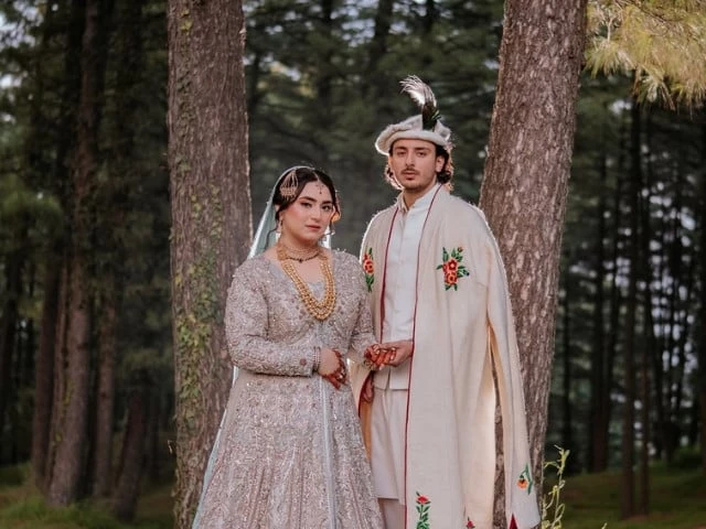 The groom wore an off white shalwar kameez, a shuqa overcoat and a feathered Gilgiti cap called parxin, with an embroidered shawl draped around him. The bride showed up in a light blue gown, golden jewellery and hair tied up to complete the look. A few days later Valima pictures also went viral in which Hasan appeared suited up and the Mrs. was seen in red.