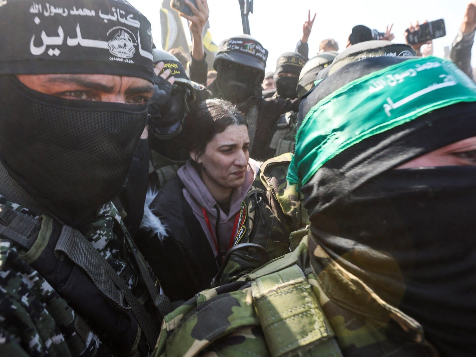 “Thousands of civilians – children, women, elderly people – are here to witness the scene,” he said. “Dozens of fighters [from both Hamas and Palestinian Islamic Jihad] are lined up in the area, as they prepared for the arrival of the Israeli captives along with the Red Cross. They are trying to control the situation on the ground and organise the exchange. Hamas fighters are on the rooftop of the house. Other onlookers are on the rooftops of nearby buildings.”