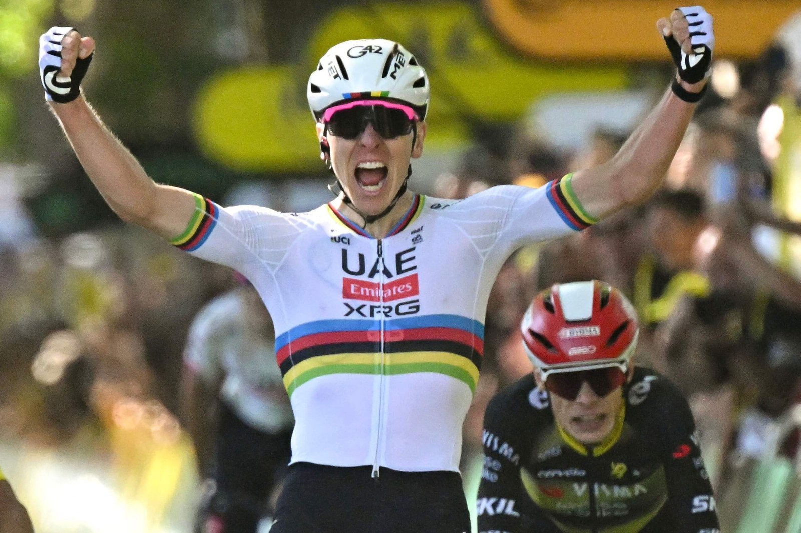 Reigning champion Tadej Pogacar overtook race leader Mathieu van der Poel just before the line to win stage four of the Tour de France on Tuesday, and is now level at the top of the general classification after earning his 100th career victory.