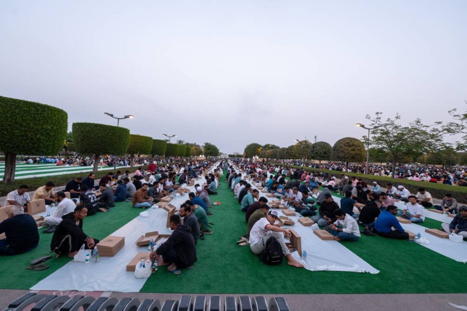 Gulf Today camera has been monitoring the numbers of people arriving at the Iftar tables in the surrounding areas of the mosque, with teams trained to receive the fasting people and organise their seating. Each meal for the fasting person includes water, milk, and dates, in addition to food boxes containing ready-made meals to provide comfort for the fasting people.