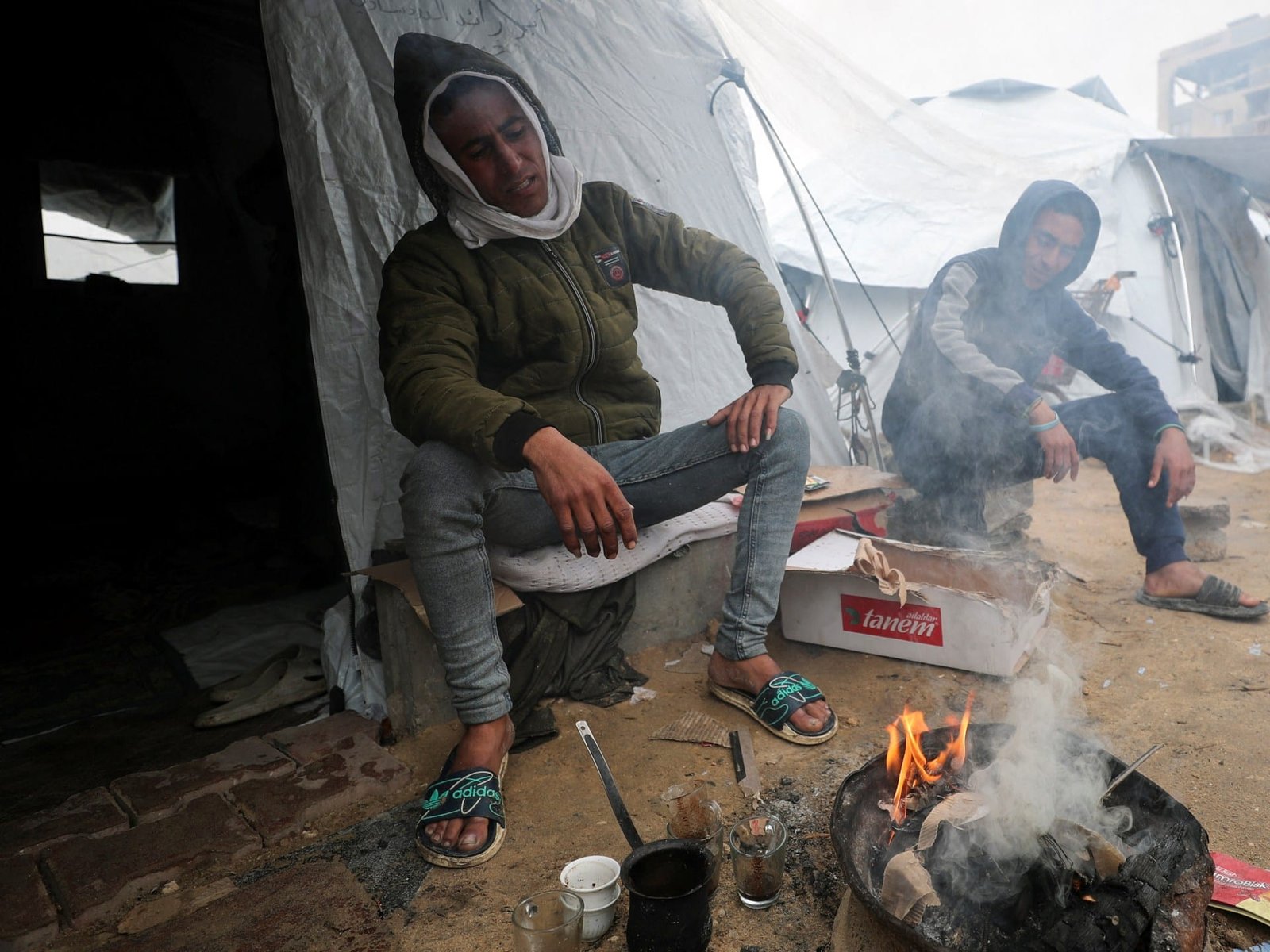 Displaced Palestinians languish in makeshift tent encampments as harsh winds and rain hit the Gaza Strip.