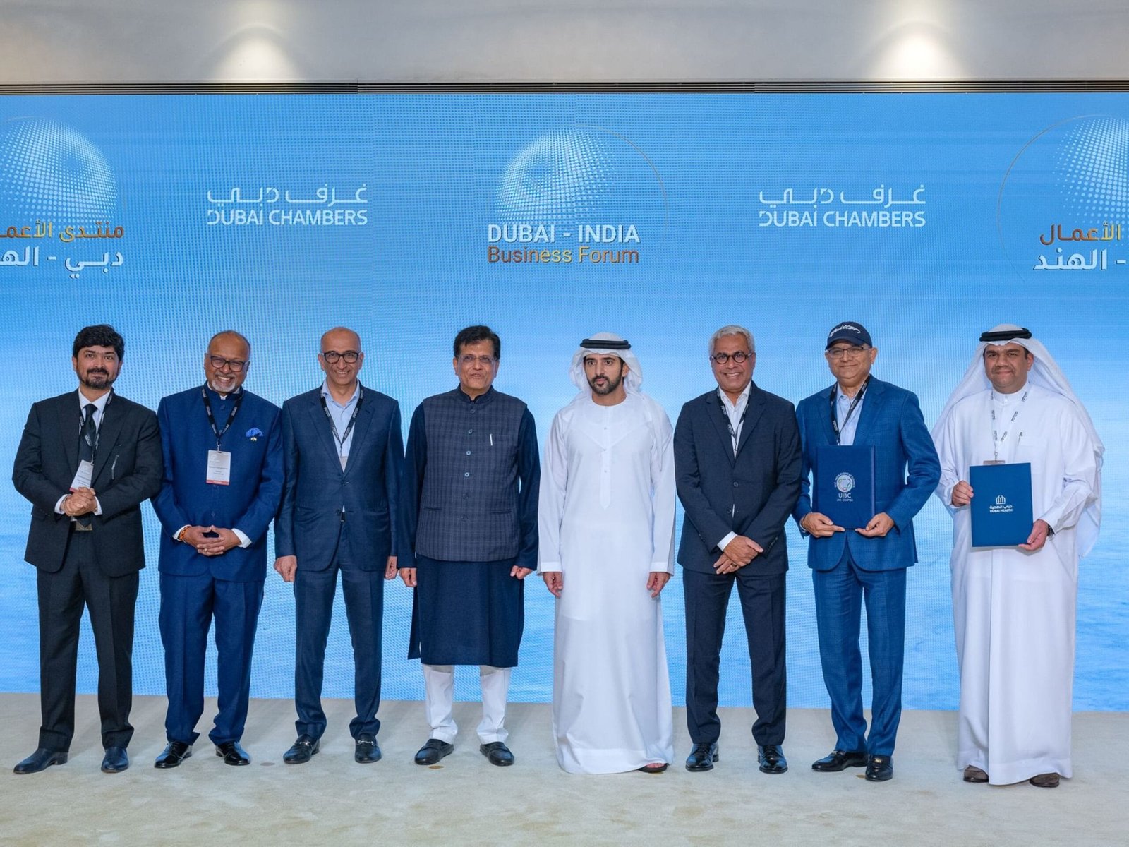 Sheikh Hamdan Bin Mohammed Bin Rashid Al Maktoum, Crown Prince of Dubai, Deputy Prime Minister, and Minister of Defence; and Piyush Goyal, India’s Minister of Commerce and Industry, on Thursday witnessed the signing of eight Memorandums of Understanding (MoUs) aimed at deepening collaboration across key sectors including infrastructure, healthcare, higher education, maritime services, logistics, and private sector engagement.